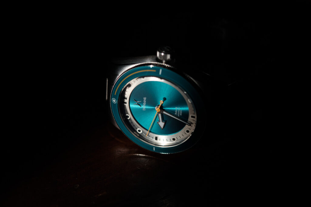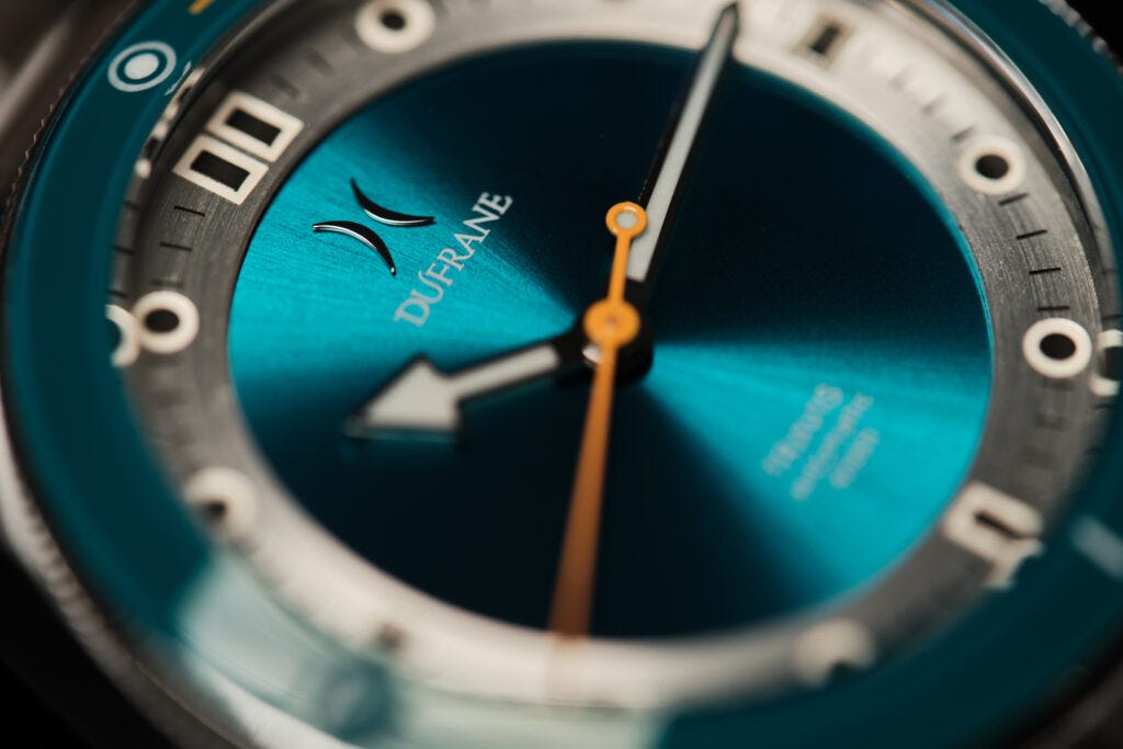 In addition, the cardinal markers on the bezel are also lumed and bear no other markers other than the quarter-hour orange arc. It makes for a very clean looking surface that is further enhanced by the small text bearing the watch's name, the word "automatic" in lowercase, and the depth rating (656 feet) above the six-o'clock marker. The logo for the watch is a simple affair: two polished rhodium arcs sit above the "DuFrane" word mark under the 12-o'clock marker.