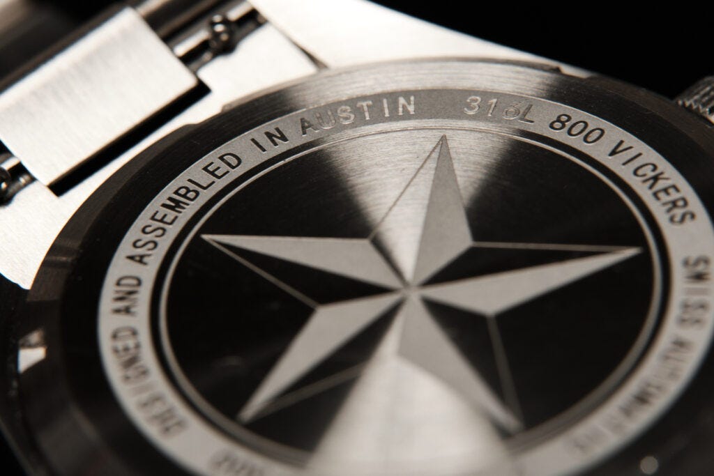 The caseback is a stainless steel screw-down affair with the five-pointed Texas Star on it and "Assembled in Austin" etched prominently alongside the steel class and hardness rating. This is one of the few things I'd change about the Travis (along with that date complication I mentioned); I'd have much preferred an exhibition caseback - though, to be fair, this is my gripe about all watches, no matter the movement inside. You could hand me a quartz watch and I'd likely mutter something about wanting to see the battery and circuits without taking the back off or some such.