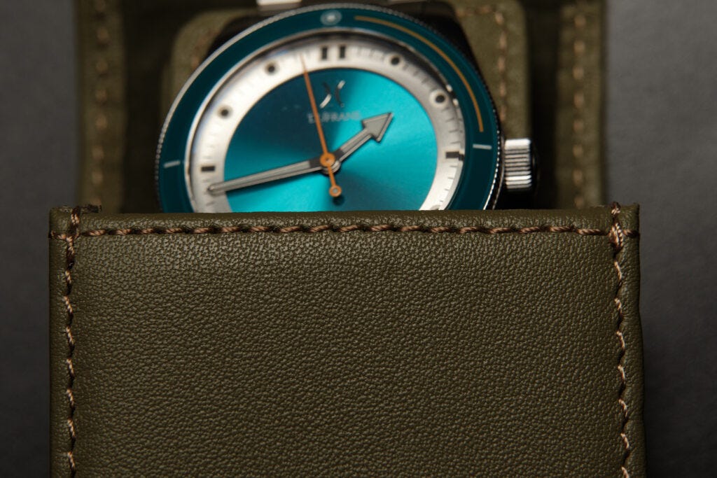 The retail version of the travis arrives in fairly nondescript packaging; there's actually no outer branded cardboard box or inner hard case. Rather, the watch arrives in a green leather travel pouch that was wrapped well in bubble wrap and placed inside the shipping box. I kind of appreciate this; I don't like throwing watch boxes away as that reduces the value of the watch and not having one to store makes things a bit easier.