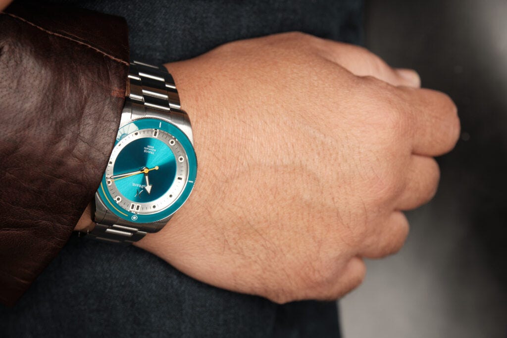 The three colorways on the Travis seem to have been chosen with some care and then executed really, really well. While I didn't have hands-on time with the Juniper colorway (which apparently has a linen-esque dial), the Sky and Dusk units are excellently executed. The color rendition on them is excellent; the Sky is a great shade of teal and the sapphire bezel and dial give off great reflections while staying legible. It's a glossy sunburst teal that reminds me of the reflections off some of the lakes I spent a lot of my youth around. It's definitely eye-catching in a really good way.
